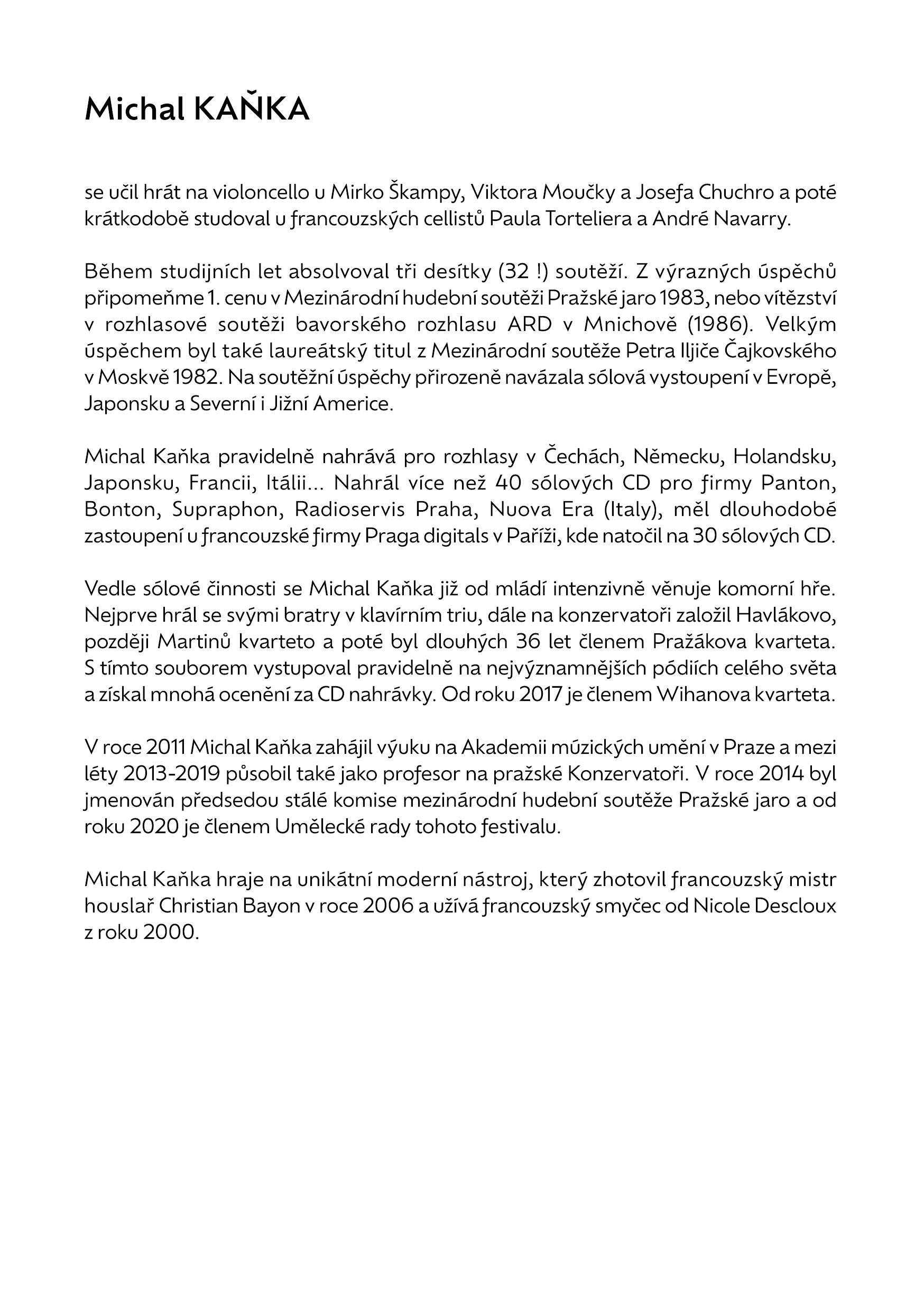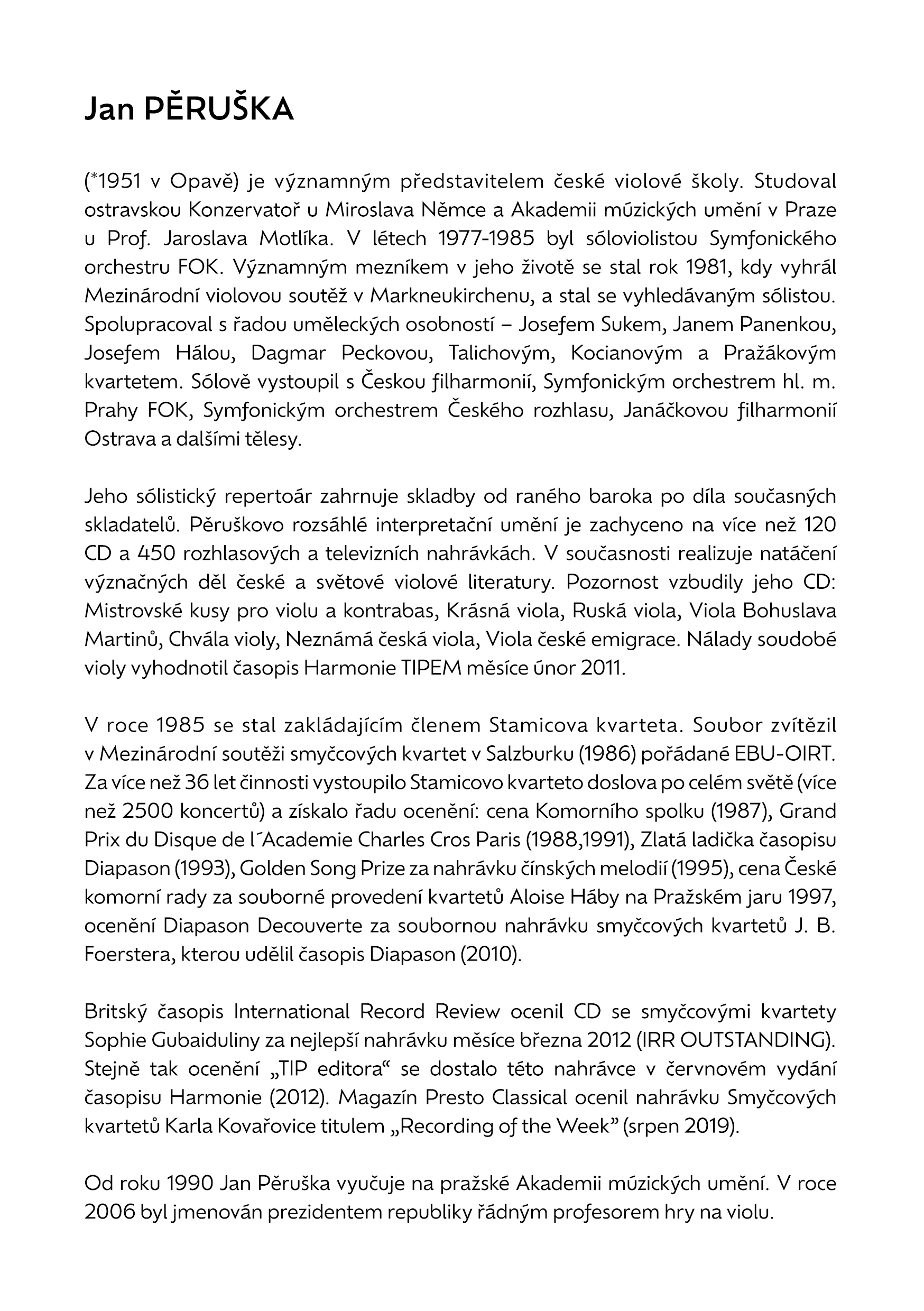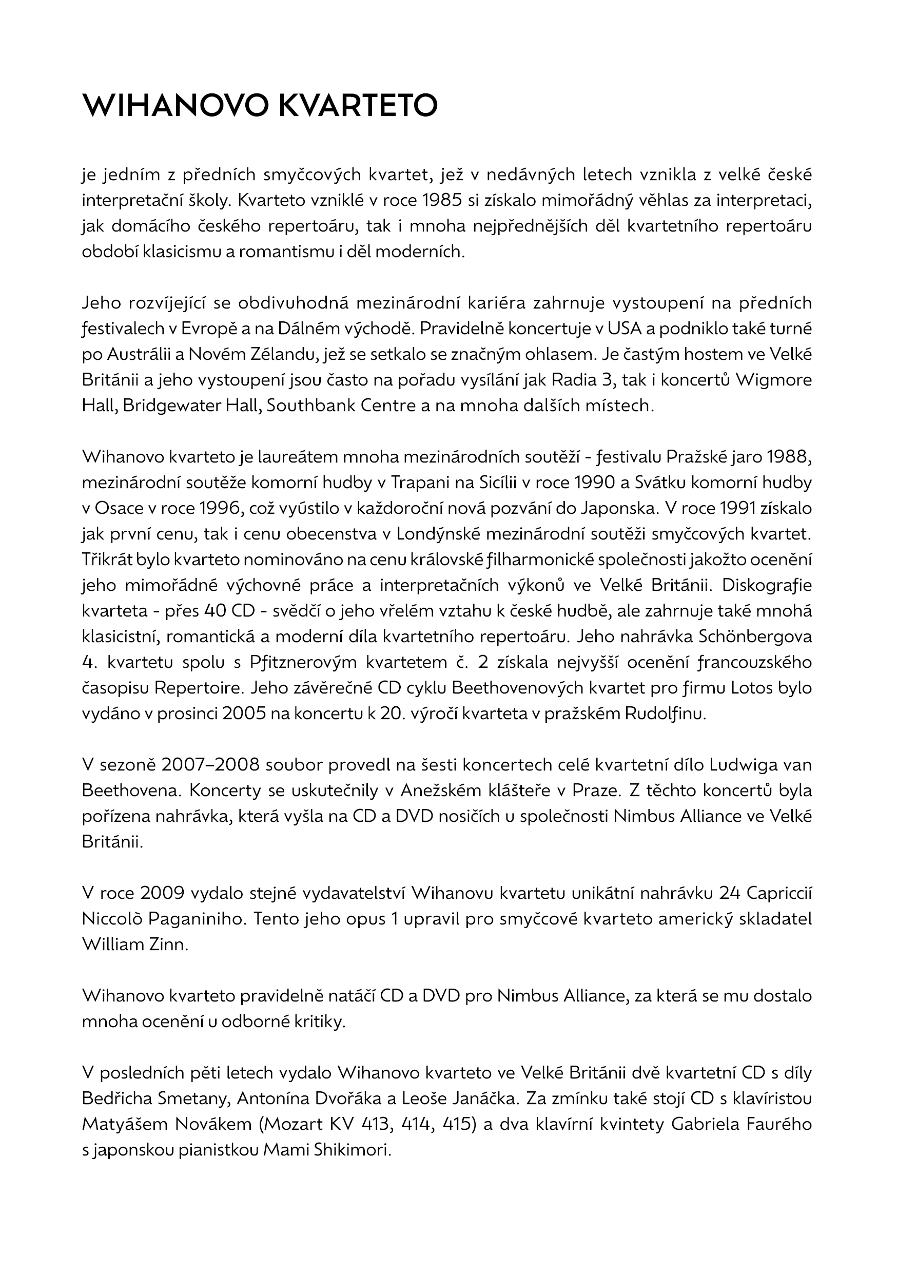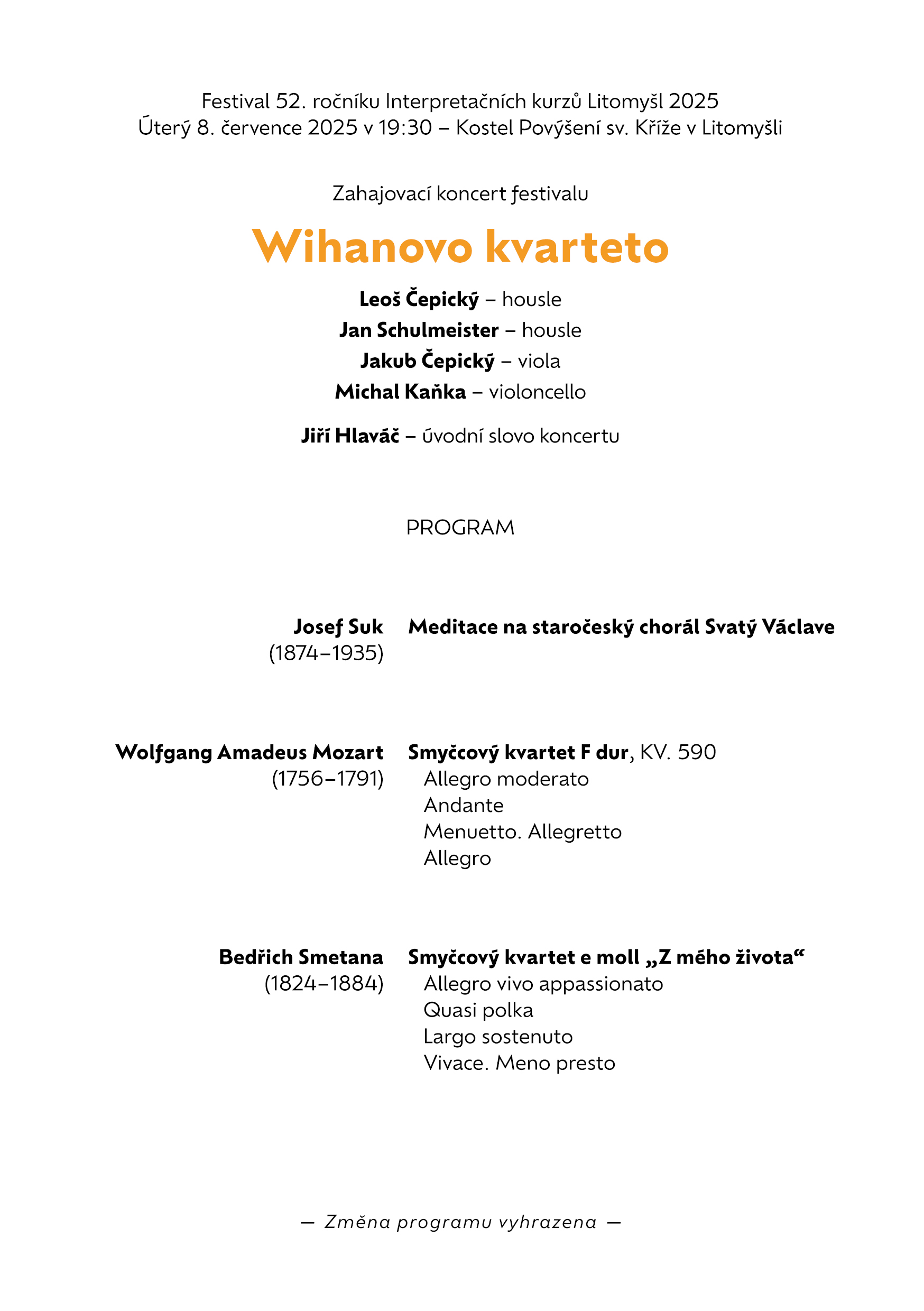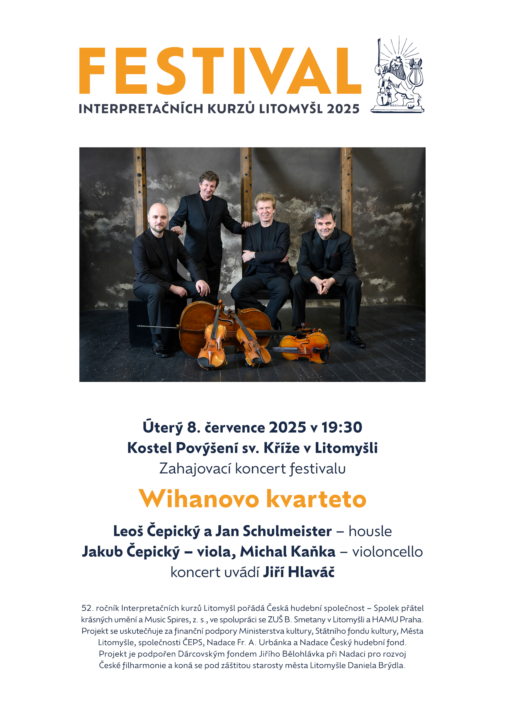 Účinkuje Wihanovo kvarteto ve složení Leoš Čepický a Jan Schulmeister – housle, Jakub Čepický – viola a Michal Kaňka – violoncello.