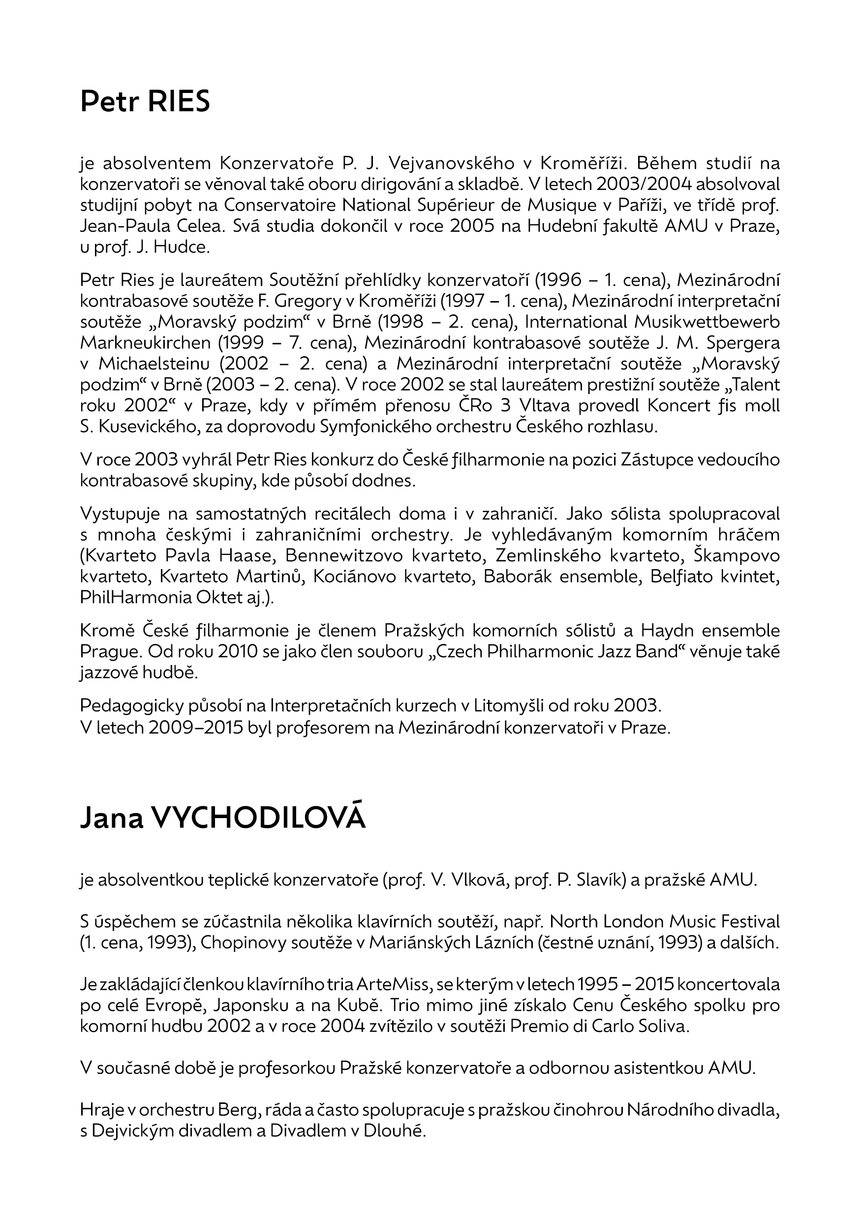 Účinkují kontrabasista Petr Ries a klavíristka Jana Vychodilová, v klavírním triu zahrají Lukáš Klánský, Leoš Čepický a Michal Kaňka.
