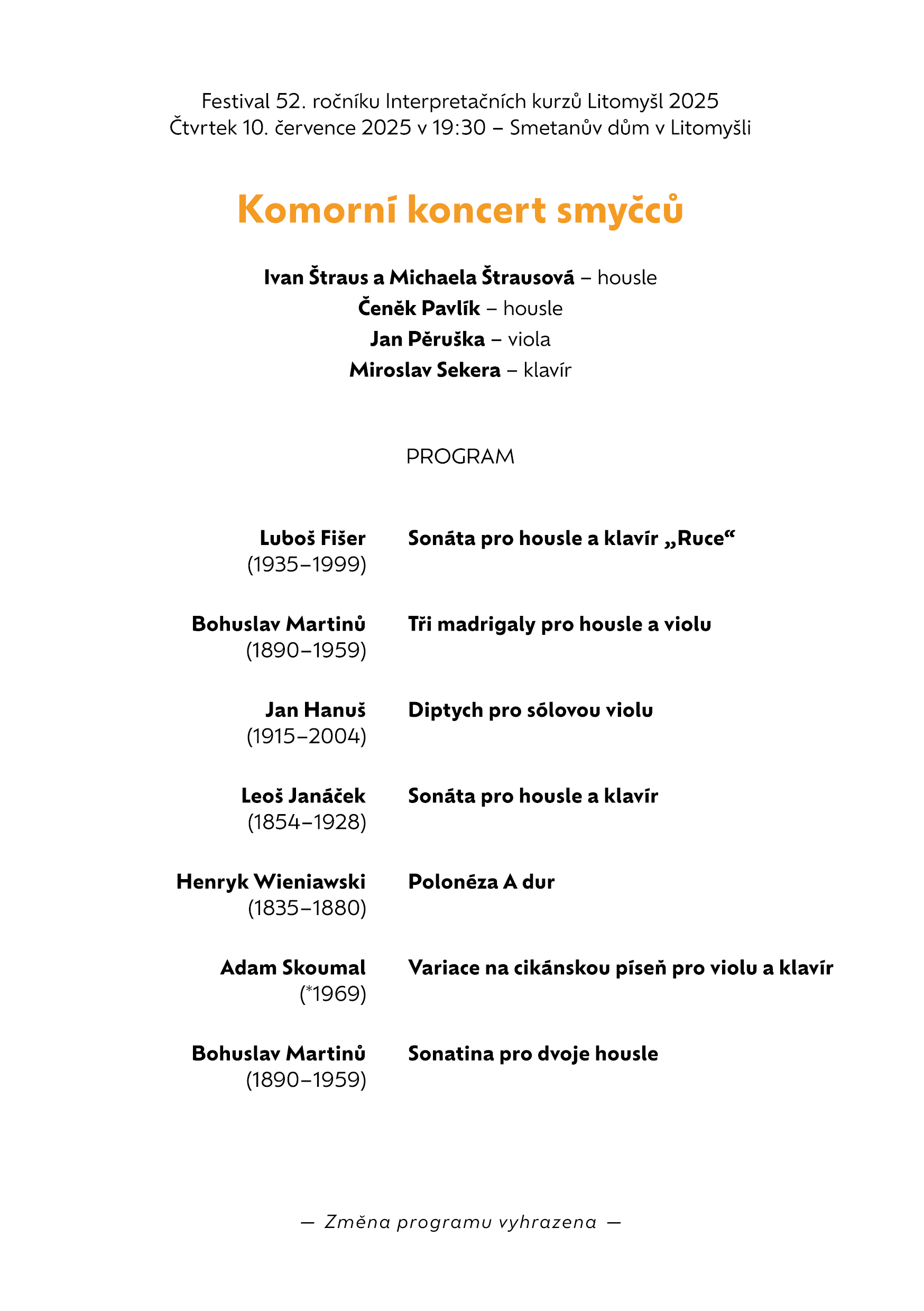 Program: Bohuslav Martinů, Jan Hanuš, Luboš Fišer, Adam Skoumal a další.