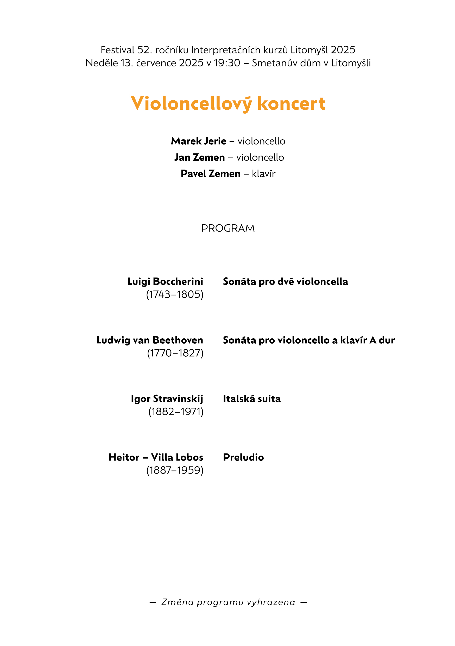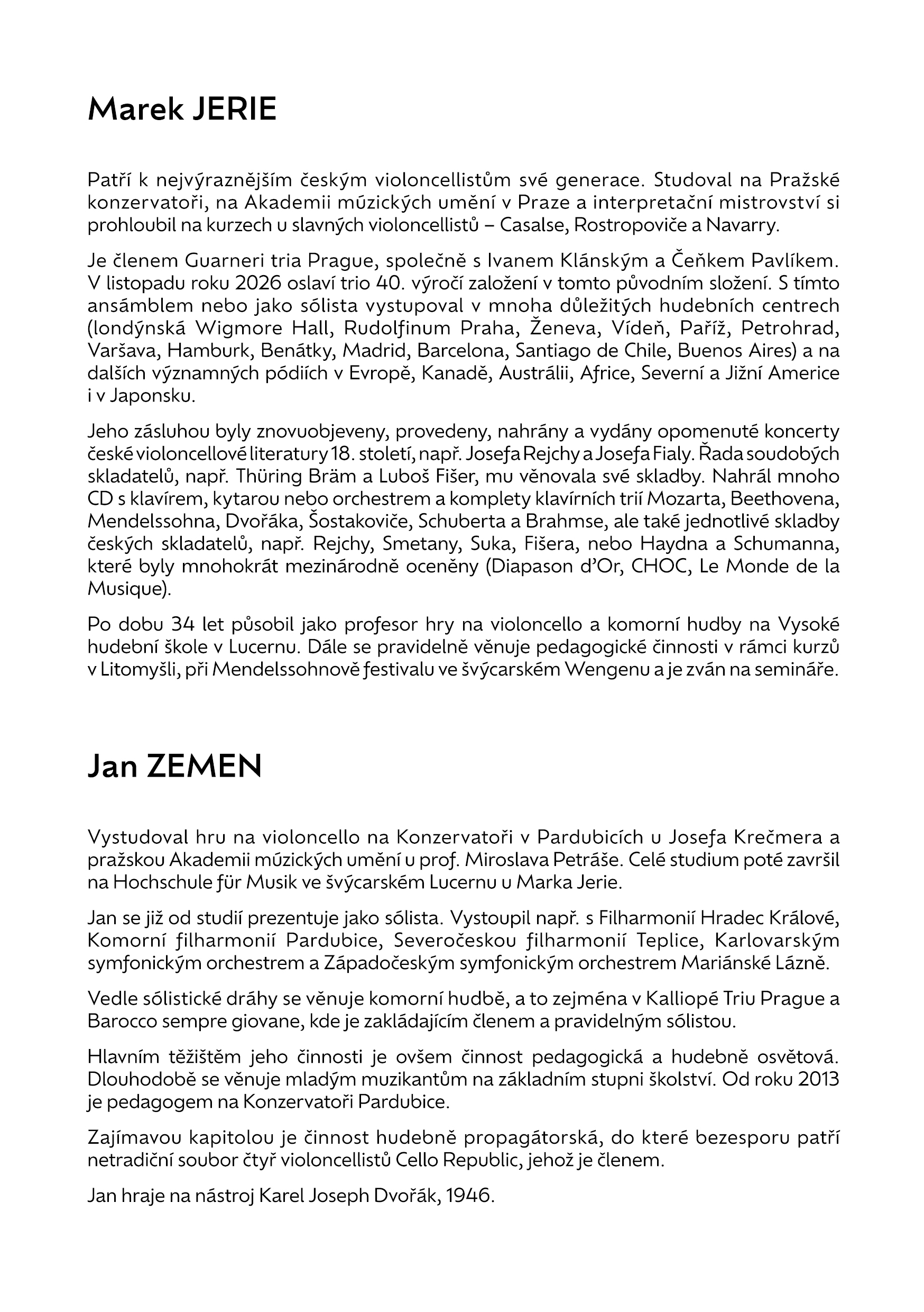 Účinkují lektoři violoncella Marek Jerie a Jan Zemen, hosty večera budou violoncellistka Marie Součková a klavírista Pavel Zemen.